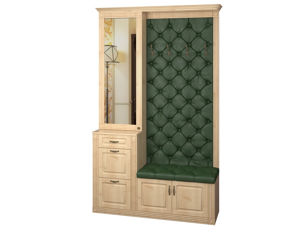 Используемый материал: корпус - ламинированное ДСП 16 мм; зеркало; фасады, карниз и пилястры - МДФ; ЛДВП. Мягкая панель декорирована каретной стяжкой. Доступен выбор вариантов ткани для обивки: это может быть велюр, рогожка или экокожа различных цветов.