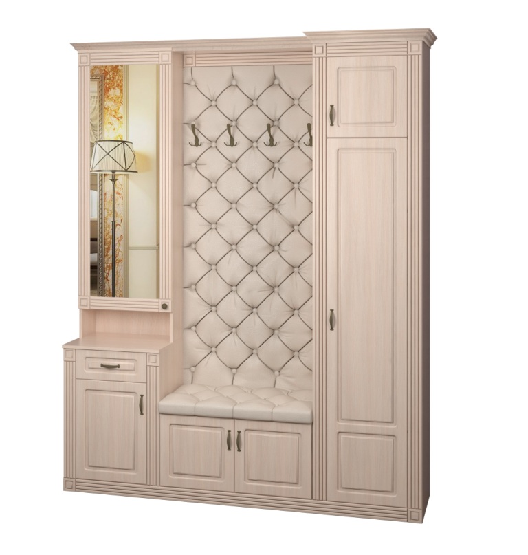 Используемый материал: корпус - ламинированное ДСП 16 мм; зеркало; фасады, карниз и пилястры - МДФ; ЛДВП. Мягкая панель декорирована каретной стяжкой. Доступен выбор вариантов ткани для обивки: это может быть велюр, рогожка или экокожа различных цветов.