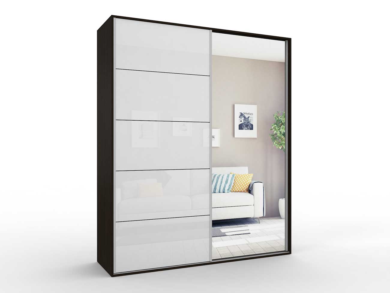 В базовую комплектацию шкафа входит кромка 0.4 мм, ручки торцевые, корпус - ламинированное ДСП 16 мм, фасады зеркало/цветное стекло, ламинированное ДВП, направляющие Версаль, ходовые ролики РКМ-70